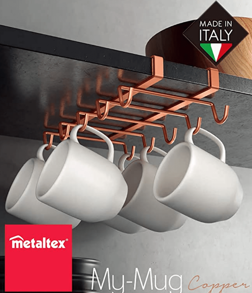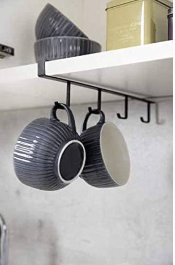 Quand on suspend ses tasses, on gagne énormément de place. J’ai pu ainsi dans un même placard ranger les verres à eau en bas et au dessus les tasses à café et mugs. Le mieux encore en terme de prix est sur ShowRoom à 6 euros en général