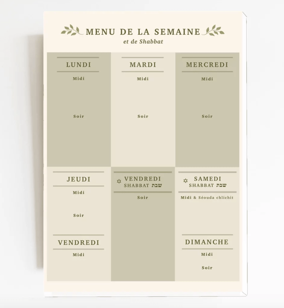 Si je devais vous conseiller une première étape d’organisation à mettre en oeuvre, c’est bel et bien la préparation des menus. Tout bête vous me direz, mais on y pense pas tout le temps. On se décharge mentalement en les écrivant dimanche soir en prévoyant jusqu’à Chabbat. Et pour que les menus plaisent à tout le monde, rédigez les avec votre mari et vos enfants.