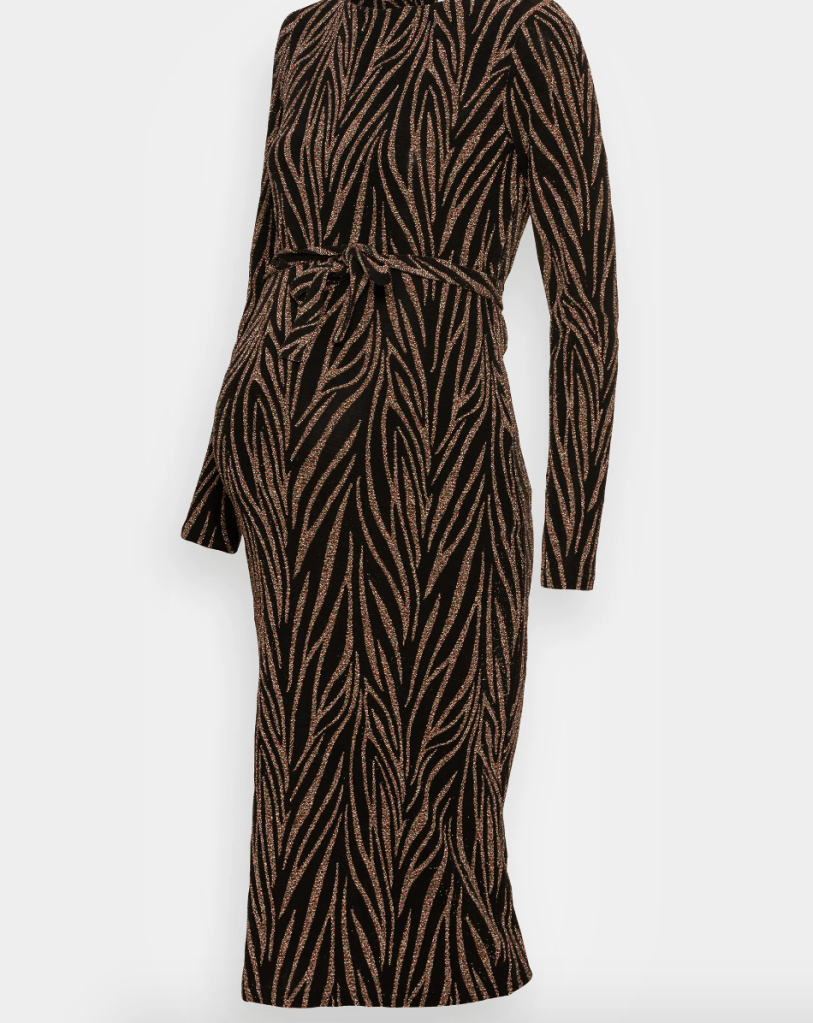 Une ceinture taille haute qui ne vous gênera pas et structurera votre tenue. Un petit sac avec un rappel doré de la ceinture. On n’oubliera pas de coudre la fente latérale 😉.