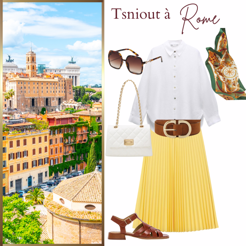Quoi de mieux que de se parer d’un foulard style baroque, une jolie paire de lunettes de soleil pour un côté diva italienne et du jaune pour être en accord avec la ville?