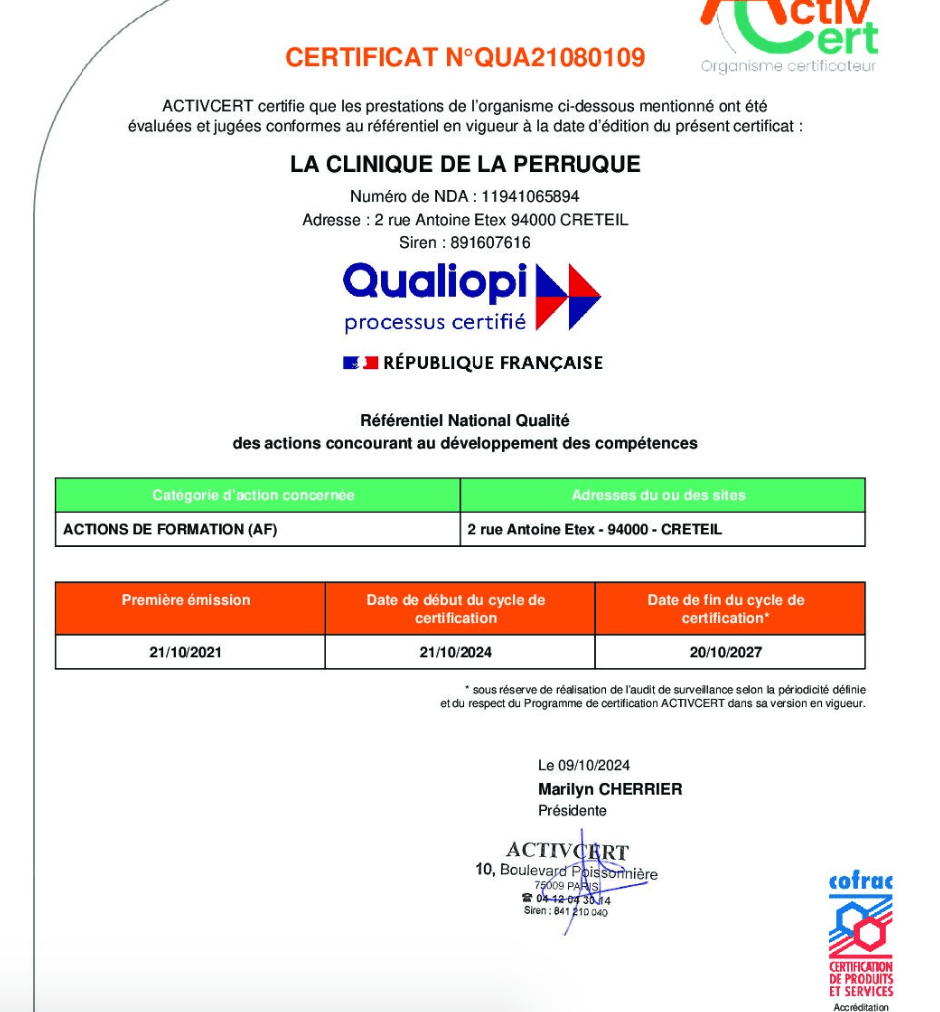 Les retours sont unanimes : « cette formation permet d’acquérir des compétences précieuses pour répondre aux besoins spécifiques des personnes en situation de perte de cheveux. Sarah est qualifiée et à l’écoute, et l’approche est à la fois technique et humaine. »
